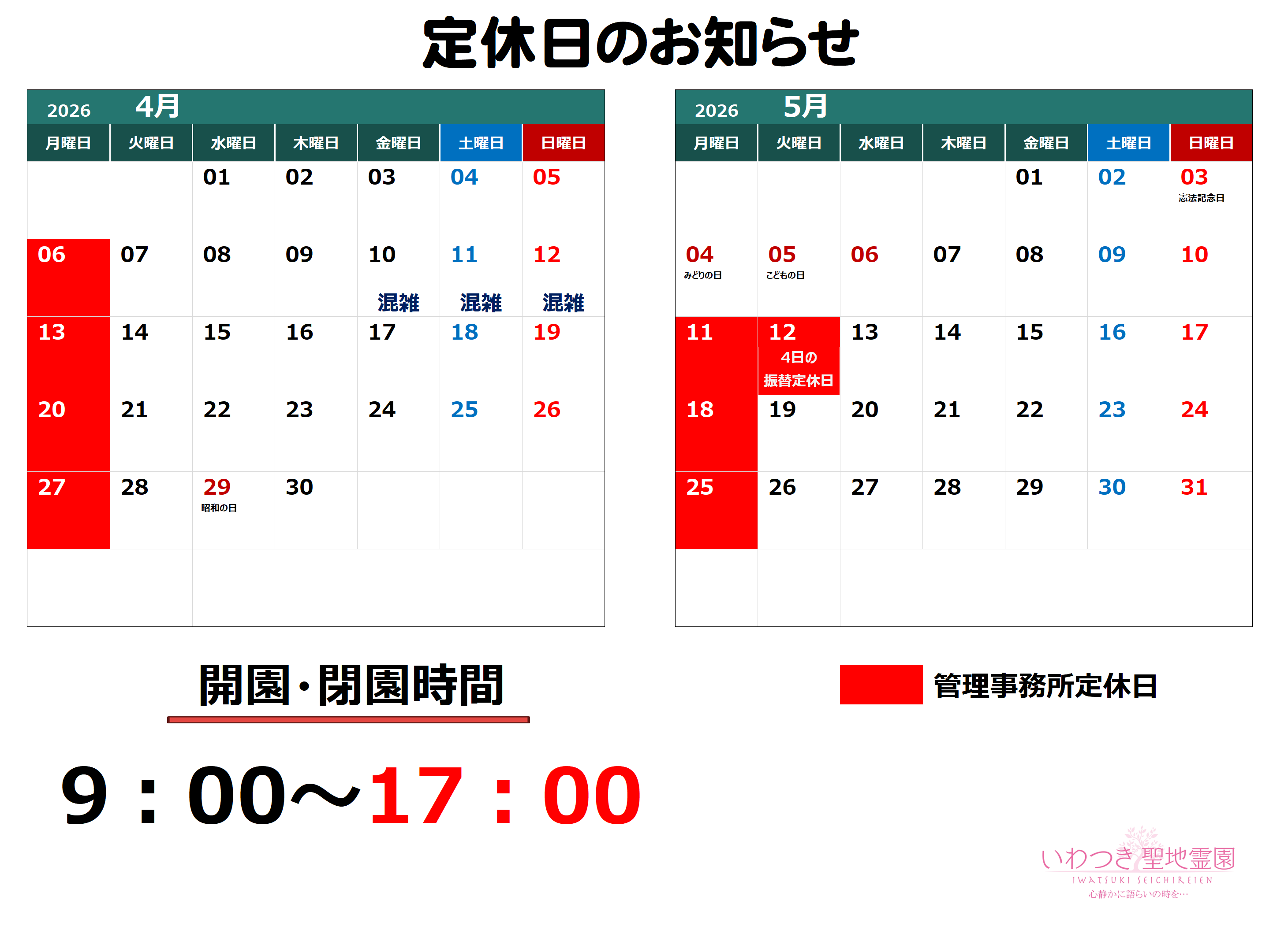 2026年4月・2026年5月の定休日情報